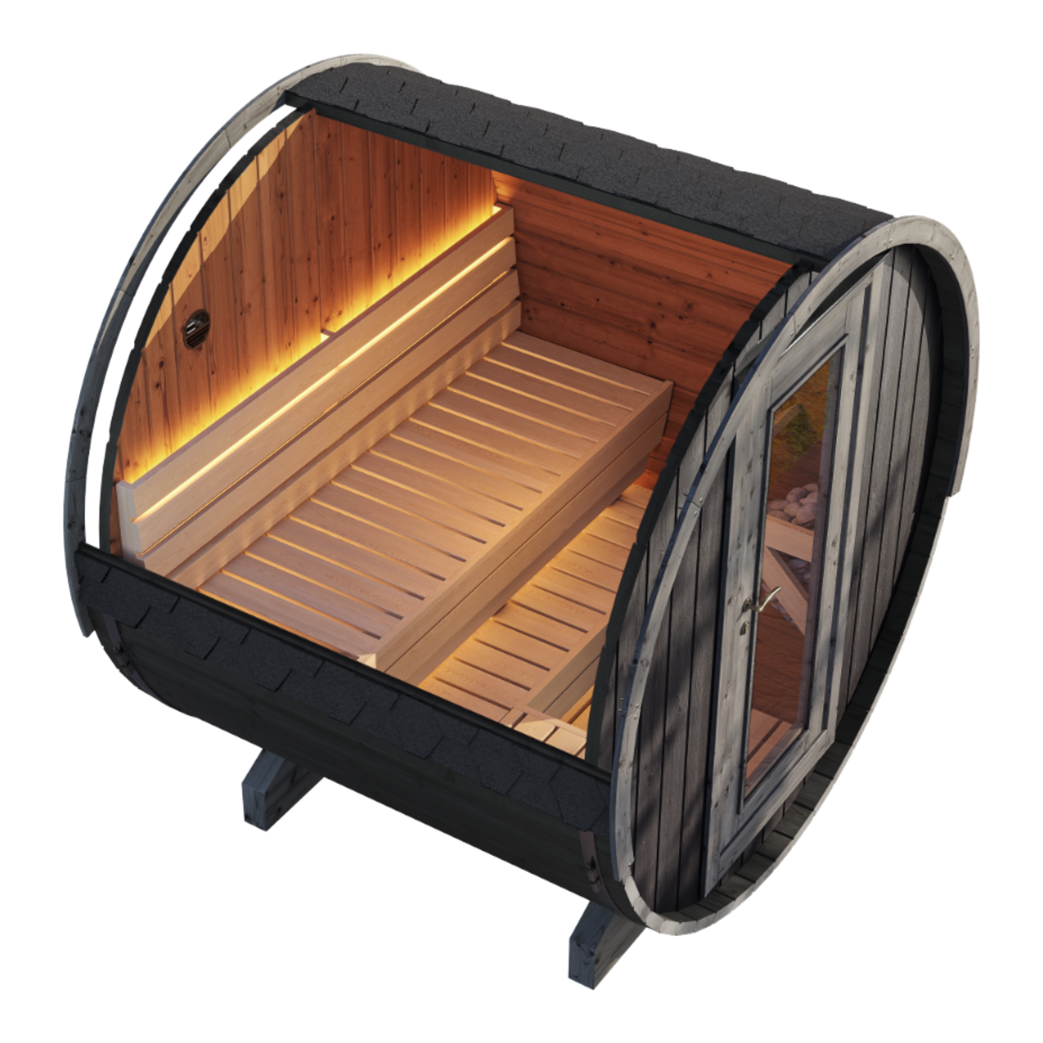 Eintaklega vel heppnuð 3-4 manna saunatunna fyrir þá sem vilja skapa góða sauna-stemningu en með litlu fyrirrúmi.